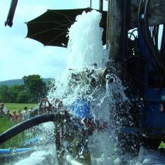 Um das erforderliche Bohrgerät vom Typ Nordmeyer DSB 2 aufbauen und nutzen zu können, musste diese Leitung täglich abgeschaltet und geerdet werden. Dies erfolgte im engen Kontakt mit dem zuständigen Stromversorgungsunternehmen. Die Schüttung des Artesers betrug 150 cbm/h bei 0,55 bar. Das bedeutet ein Wasserspiegelniveau bei ca. 5,50 m über Gelände.