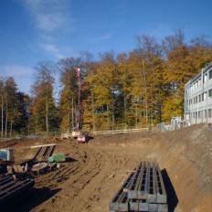 Für die von der Baugrubensohle aus herzustellende Gründung wurden Bohrpfähle im Durchmesser von 90 cm und 120 cm hergestellt. Die insgesamt ca. 1700 lfdm 90-er und ca. 520 lfdm 120-er Pfähle mussten bis zu 22 m tief gebohrt werden, damit sie ihre späteren Lasten in den Tonstein abtragen können. Dabei mussten immer wieder eingelagerte Sandsteinblöcke durchörtet werden.
