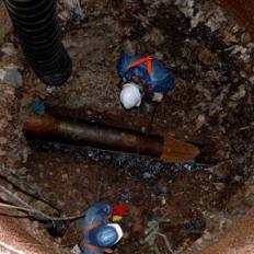 Dazu mussten 5 Tandemschächte im 26 m tiefen Deponiekörper hergestellt werden, aus dessen Schutz heraus die PE 100, Da 280 mm, SDR 7,4 Drainageleitungen im dynamischen Berstliningverfahren saniert werden konnten.