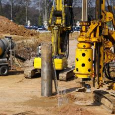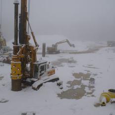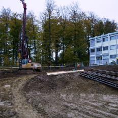 Für die von der Baugrubensohle aus herzustellende Gründung wurden Bohrpfähle im Durchmesser von 90 cm und 120 cm hergestellt. Die insgesamt ca. 1700 lfdm 90-er und ca. 520 lfdm 120-er Pfähle mussten bis zu 22 m tief gebohrt werden, damit sie ihre späteren Lasten in den Tonstein abtragen können. Dabei mussten immer wieder eingelagerte Sandsteinblöcke durchörtet werden.